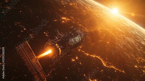 Futuristic satellite orbiting earth with golden glow, highlighting technological advancement and space exploration with artistic rendition