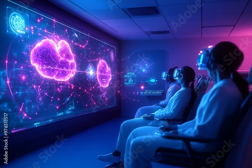 Futuristic scene featuring individuals engaging with holographic displays in a dark room, showcasing advanced technology and excitement.