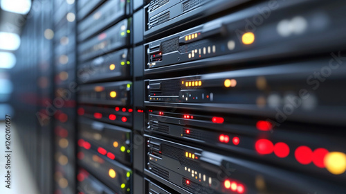 Futuristic server room with 3D storage technology, symbolizing digital advancement, data security, and innovation. Bright modern tone with blurred empty space, ideal for technology concepts and backgr