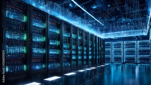 Futuristic server room with glowing data streams illuminating rows of high-tech data storage racks.