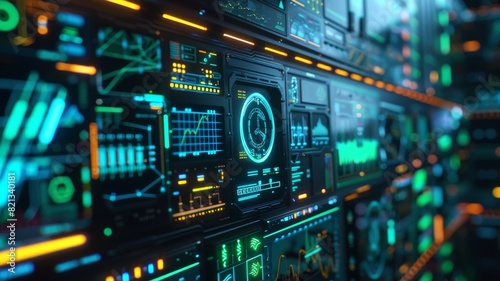 Futuristic server room with glowing digital interfaces showcasing data analytics and network activities in vibrant hues.