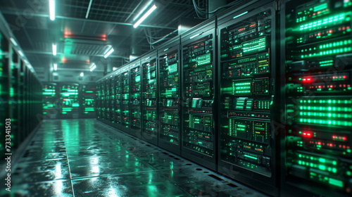 .Futuristic Server Room with Glowing Green Lights. High-tech server room with racks of data servers and glowing green LED lights, symbolizing modern data center technology.