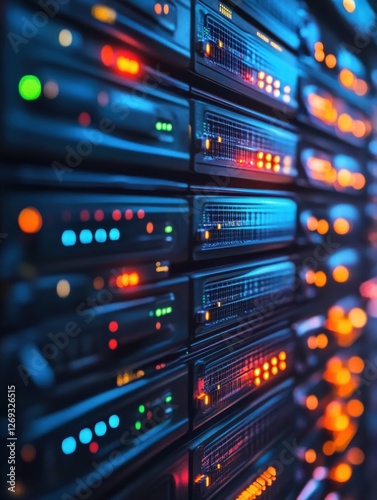 Futuristic server room with glowing lights showcases cutting-edge technology in a dark setting, highlighting modern equipment driving network connections