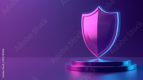 Futuristic shield on a pedestal with neon lights, symbolizing protection and security in a high-tech environment.
