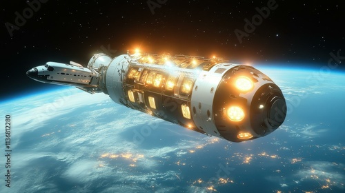 Futuristic silver spacecraft with glowing orange lights orbiting Earth in space, high detail sci-fi scene perfect for technology, exploration, innovation themes, deep blue planet background, cosmic a