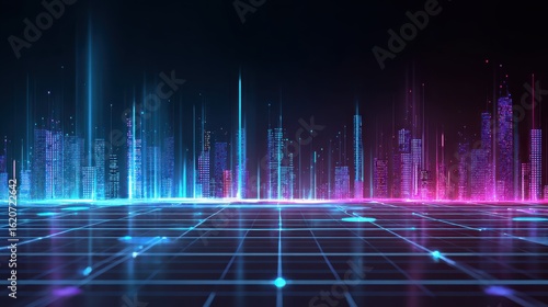 Futuristic smart city emerging from digital grid at night, illuminated by vibrant neon lights