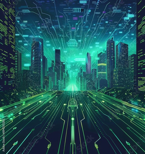 Futuristic Smart Cyber City illustration: Innovative Urban Landscape, futuristic technology and cyber punk concept, Graphic Resources, Wallpapers, Brochure, Websites, banner, Advertising, background