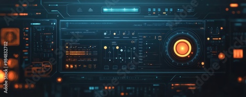 Futuristic smart home control interface with digital screens, holographic displays, and advanced technology in a sleek design showcasing advanced home automation and connectivity features.