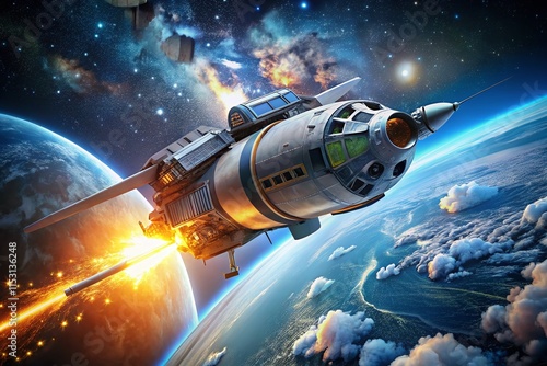 Futuristic Spacecraft Orbiting Earth: High-Resolution Stock Photo of Advanced Space Technology