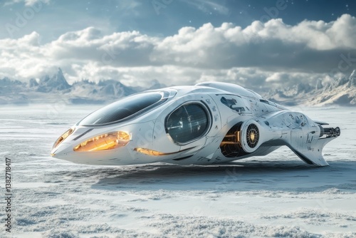 Futuristic spacecraft resting on snowy surface beneath a cloudy sky