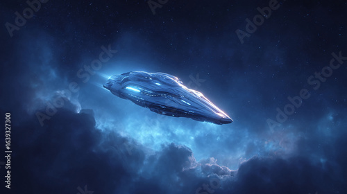 Futuristic spacecraft soaring through cosmic clouds, illuminated by ethereal light. Evokes themes of exploration, innovation, and otherworldly travel. Ideal for scifi, tech concepts.