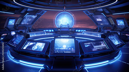 Futuristic Spaceship Bridge Control Room with Glowing Energy Sphere and Multiple Screens Displaying Data