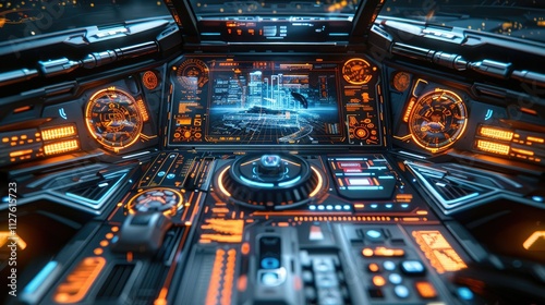 Futuristic spaceship cockpit interior with glowing controls and holographic display.