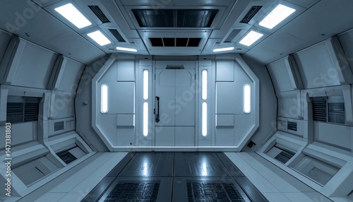 Futuristic Spaceship Corridor: Sleek Metallic Interior with Bright Lighting