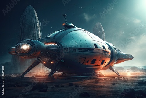 Futuristic spaceship flying near alien planet in space, retro futuristic illustration