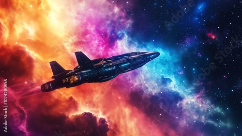 Futuristic spaceship flying through a colorful nebula with a starry background.