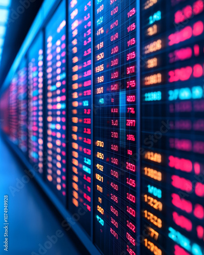 Futuristic stock exchange display with vibrant colors showcasing market data and trends. illuminated screens create dynamic atmosphere, reflecting fast paced world of finance