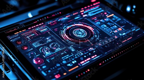 Futuristic tablet interface with glowing, dynamic user interface elements.