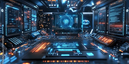 Futuristic Tech Control Room: Neon Blue and Orange Circuitry Display