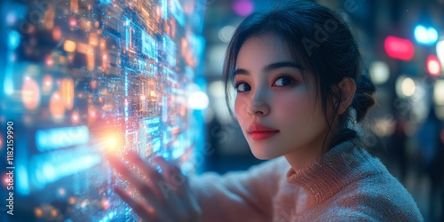 Futuristic Tech Enthusiast Exploring Holographic Interface at Night