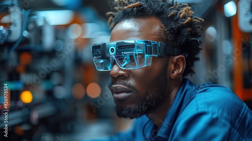 Futuristic Technician Using Augmented Reality Glasses to Repair Robotics System in High-Tech Factory - Copy Space for Text Above