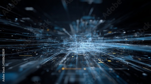 Futuristic technological backdrop displaying luminous digital connections and geometric shapes against a darkened background creates data visualization.