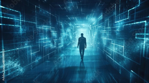 Futuristic technological corridor with a silhouetted figure moving through a dark digital matrix Abstract data and energy grid create an immersive cyberpunk atmosphere for and discovery