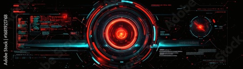 Futuristic technological design of the Artificial intelligence(AI) and data center. A glowing red and blue circle pattern on the complex screen.