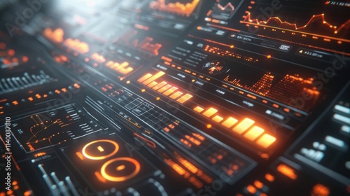 Futuristic Technological Interface with Glowing Orange Data Visualizations