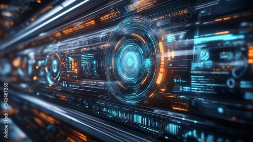 Futuristic Technology Abstract Graphics with Digital Neon Blue and Orange Geometric Patterns for Cyberpunk Sci-Fi Data Visualization
