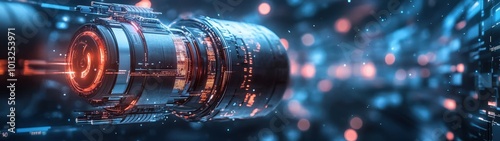 Futuristic technology concept featuring a glowing engine in a vibrant digital environment, showcasing innovation and advancement.