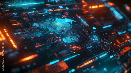 Futuristic technology for processing information flow, world big data network, monitor screen in perspective