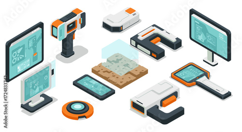 Futuristic technology gadgets in isometric style for innovative design concepts