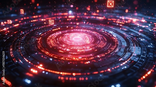 Futuristic Technology Interface: A vibrant digital display of swirling circuits and glowing nodes, reminiscent of a high-tech control panel or spaceship interface.