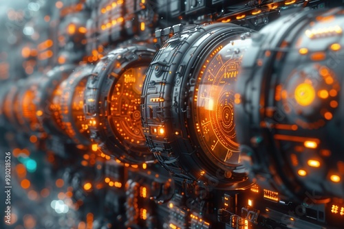 Futuristic technology interface with glowing orange lights and intricate circuitry, depicting advanced data processing and connectivity