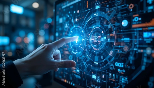 Futuristic Touchscreen Interface with Human Hand Interaction, Depicting Advanced Technology, Digital Controls, Innovation, and High-Tech Connectivity in a Virtual World