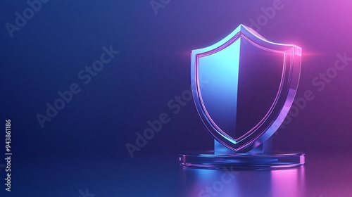 Futuristic translucent shield icon, light effects on blue and pink background, representing data protection and cybersecurity.