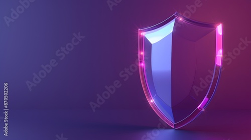 Futuristic translucent shield with neon lights on purple gradient background, symbolizing modern security and protection technology.