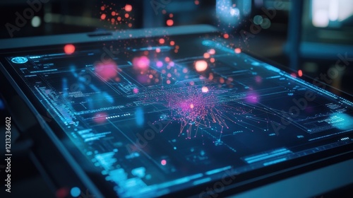 Futuristic transparent tablet device displaying a complex network growing with data processing and colorful bokeh lights in the background, representing innovation and technology