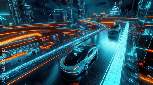 Futuristic transportation hub with trains and hover vehicles, autonomous cars cyberpunk city highway, background wallpaper AI generated image