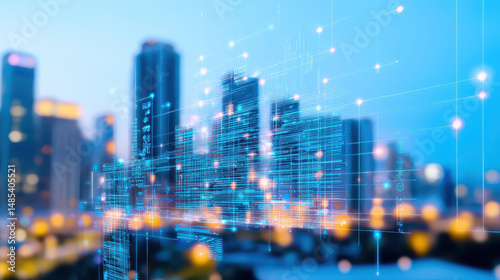 Futuristic urban cityscape with digital overlay, showcasing advanced technology and connectivity. vibrant lights create
