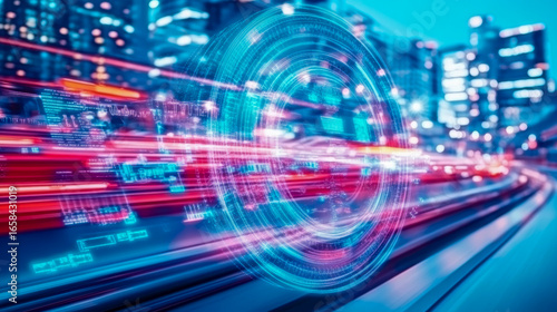 Futuristic urban landscape with abstract light streaks and swirling data streams, symbolizing rapid technological advancement and interconnected digital infrastructure