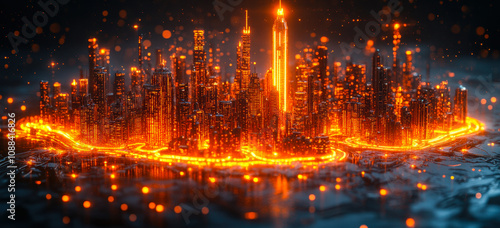 Futuristic Urban Landscape with Illuminated City Skyline and Immersive Walk-Through Map