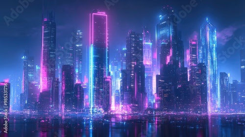 Futuristic urban skyline featuring skyscrapers illuminated with a cool color palette and a vibrant neon aesthetic