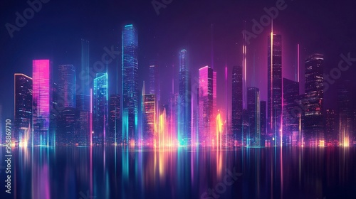 Futuristic urban skyline with bright, colorful lights and tall structures. Premium background for the latest technology needs. generative ai