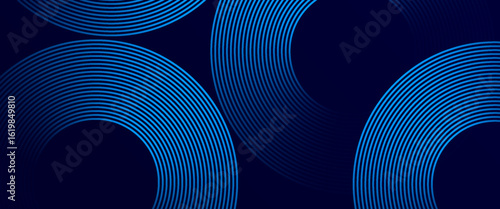 Futuristic vector background with dark navy tones and glowing blue concentric curves forming dynamic circular patterns. Ideal for tech, innovation, or digital themes