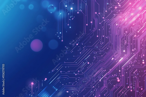 Futuristic vector illustration of an abstract circuit board with neon blue and purple gradients, showcasing intricate digital patterns and tech elements