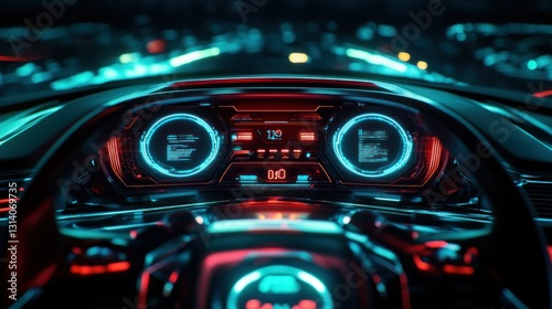 Futuristic vehicle dashboard display with bright digital readouts and lights