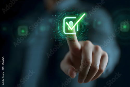 Futuristic Verification: Hand Activating a Glowing Green Checkmark on a Digital HUD.