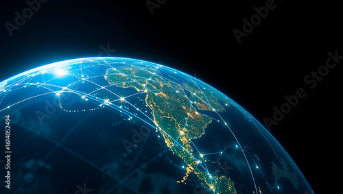 Futuristic view of planet Earth from space, illustrating a glowing global network of data transmission and communication.